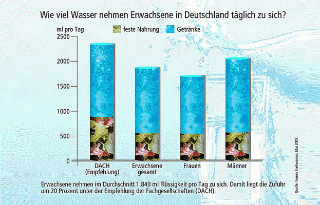 Trinken wir zu wenig, reduziert sich die Blutmenge. Das Blut fließt langsamer, und gleichzeitig werden Muskeln und Gehirn mit weniger Sauerstoff und Nährstoffen versorgt. Studien zeigen als Folgen ein Nachlassen der Aufmerksamkeit und Konzentration, verschlechtertes Kurzzeitgedächtnis, langsamere Reaktionen und vermehrte Schwierigkeiten, komplexe Zusammenhänge zu verstehen. Obwohl bei den Studienteilnehmer diese ersten Folgen eines Wassermangels festzustellen waren, bemerkten die Betroffenen sie selbst nicht.
