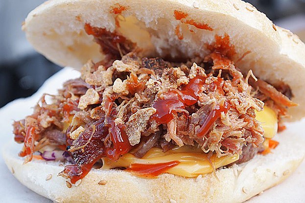 Pulled Pork bedeutet so viel wie „gezupftes Schweinefleisch“. Tatsächlich versucht man bei der Zubereitung die Schweineschulter oder den Nacken so lange zu garen, bis man das Fleisch mit einer Gabel leicht auseinanderzupfen kann. Diese amerikanische Spezialität – die sich in Deutschland immer größerer Beliebtheit erfreut - wird traditionell im Hamburgerbrötchen mit Krautsalat und einer Sauce serviert.