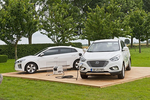 Während im batterieelektrischen Hyundai IONIQ Elektro ein 28 kWh großer Lithium-Ionen-Polymer-Akku als Energiespeicher fungiert, wird der Hyundai ix35 Fuel Cell mittels Brennstoffzellentechnologie mit Strom versorgt. Diese wandelt Wasserstoff in elektrische Energie um. Als Abgas entsteht lediglich Wasserdampf. Der Hyundai IONIQ Hybrid speichert beim Bremsen und Rollen rekuperierten Strom in seinen 1,56 kWh großen Lithium-Ionen-Polymer-Akku. Dank dieser Energie kann der Hyundai IONIQ Hybrid weite Teile der Fahrstrecke ebenfalls rein elektrisch zurücklegen.